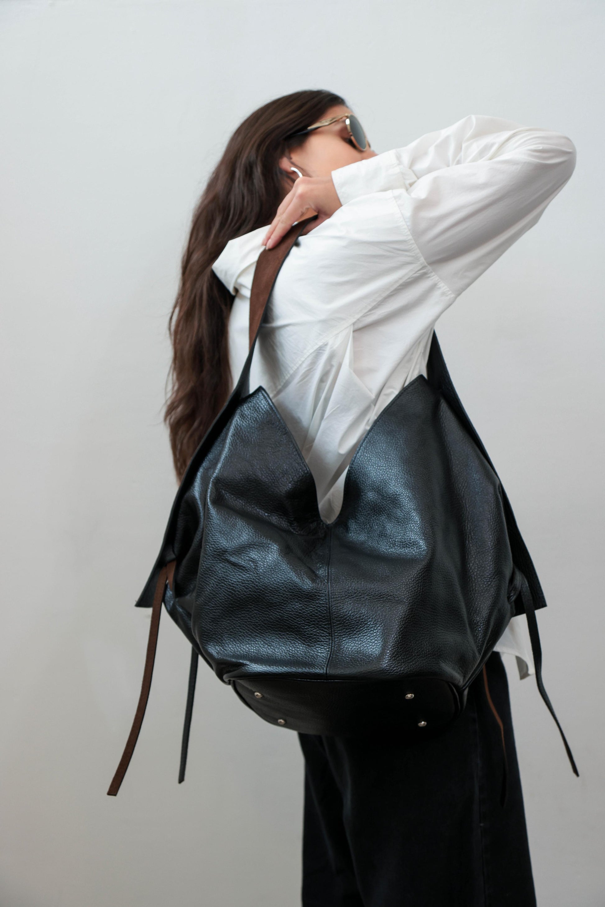 Bolso MEGA negro | correa gamuza chocolate